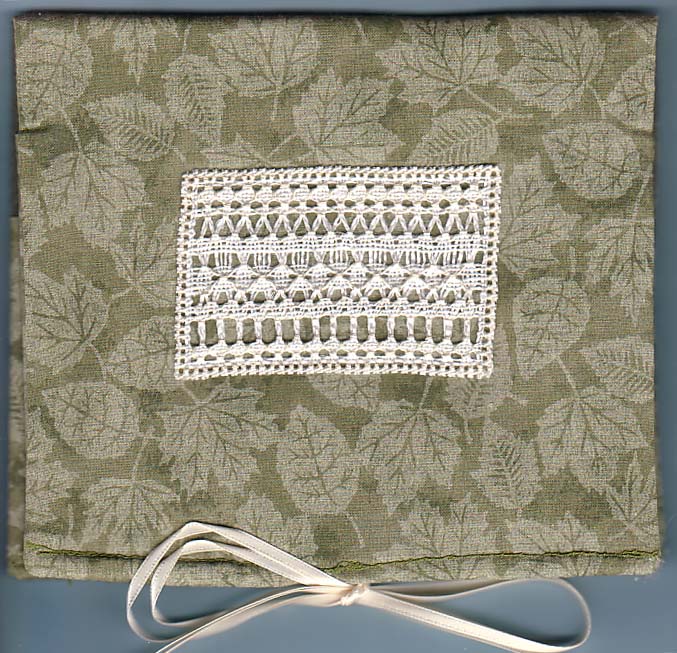 Drawn Thread Sewing PocketAuthor: ??? (someone in my friend's EGA chapter :) ) Started: March, 2003 I stitched this piece at a stitching weekend I did with three friends. One of them brought directions and materials for the drawn thread bit, and we had fun shopping for different fabrics to make the pocket at JoAnn's. Another friend graciously braved my rickety sewing machine and sewed all the pockets for us! It sat almost finished (I only had two sides of nun's stitch left) for a couple months while I worked on other things. It only took about 1/2 hour to finish it and sew it to the pocket.